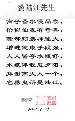 凡尊重中國古代養(yǎng)生智慧的患者,堅持“已饑方食”和定時主動補水者,均可祛病康復(fù)。如牡丹江醫(yī)學(xué)院87歲的張鵬圖飲用半年后高血壓未痊愈,陸江與他通話交流,了解他原先每日主食4兩,建議他用“已饑方食”減少主食肉食量,他理解后,將每日主食減為3兩,少吃兩塊肉,飲用一年治愈26年的冠心病和高血壓。他2003年5月31日來信說:“飲用卓康小分子團水是根治高血壓、冠心病、糖尿病的一把金鑰匙,是填補醫(yī)學(xué)空白,為人類造福,應(yīng)推廣該產(chǎn)品?!?/strong>