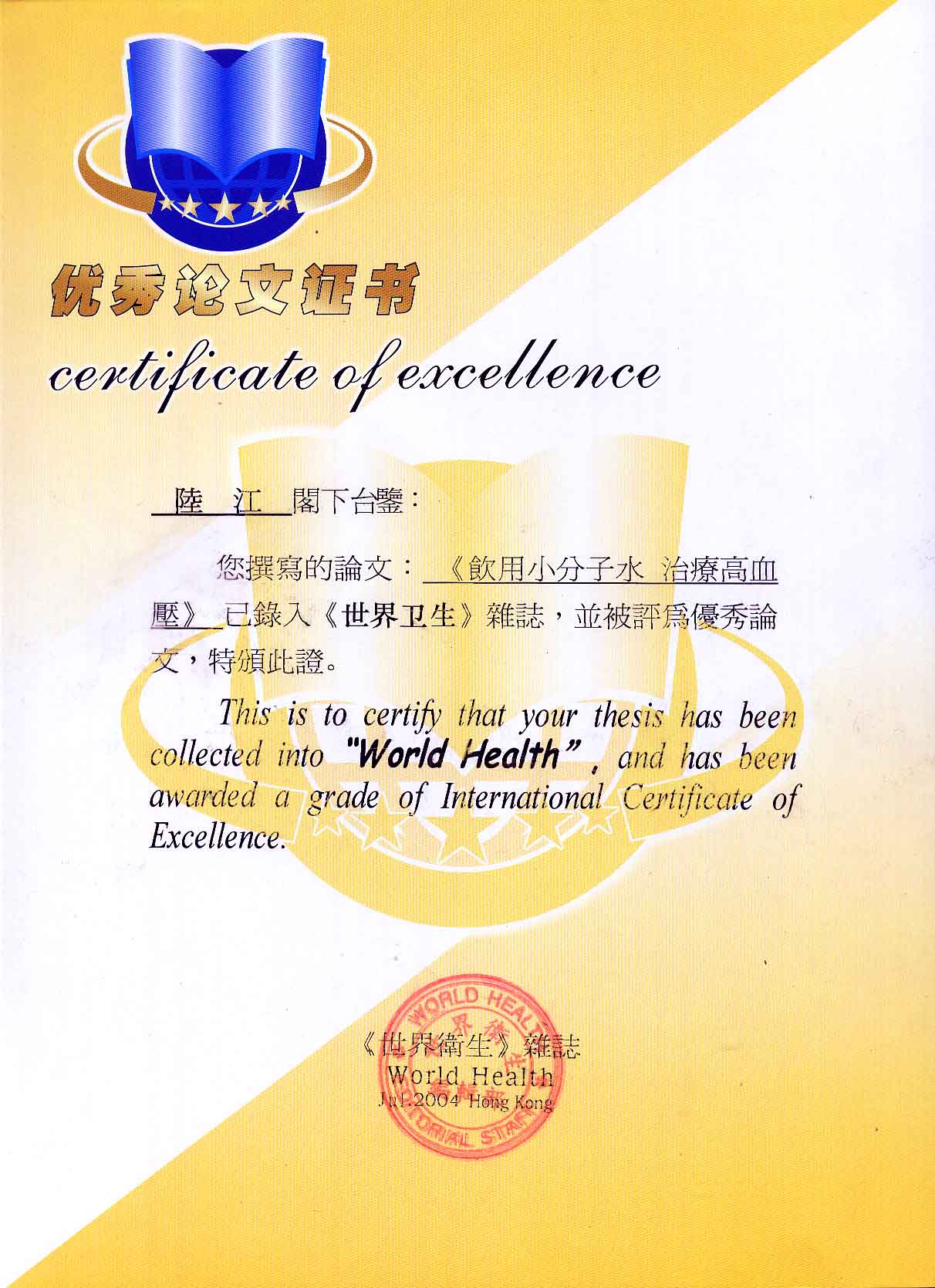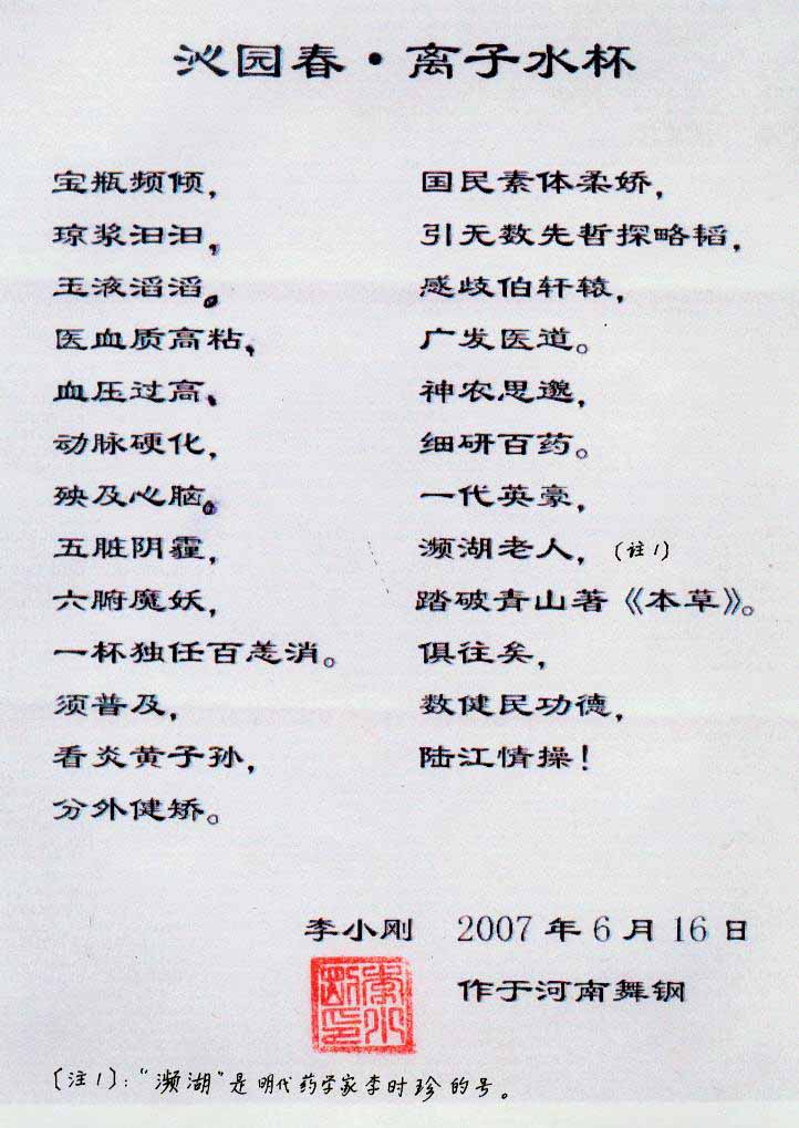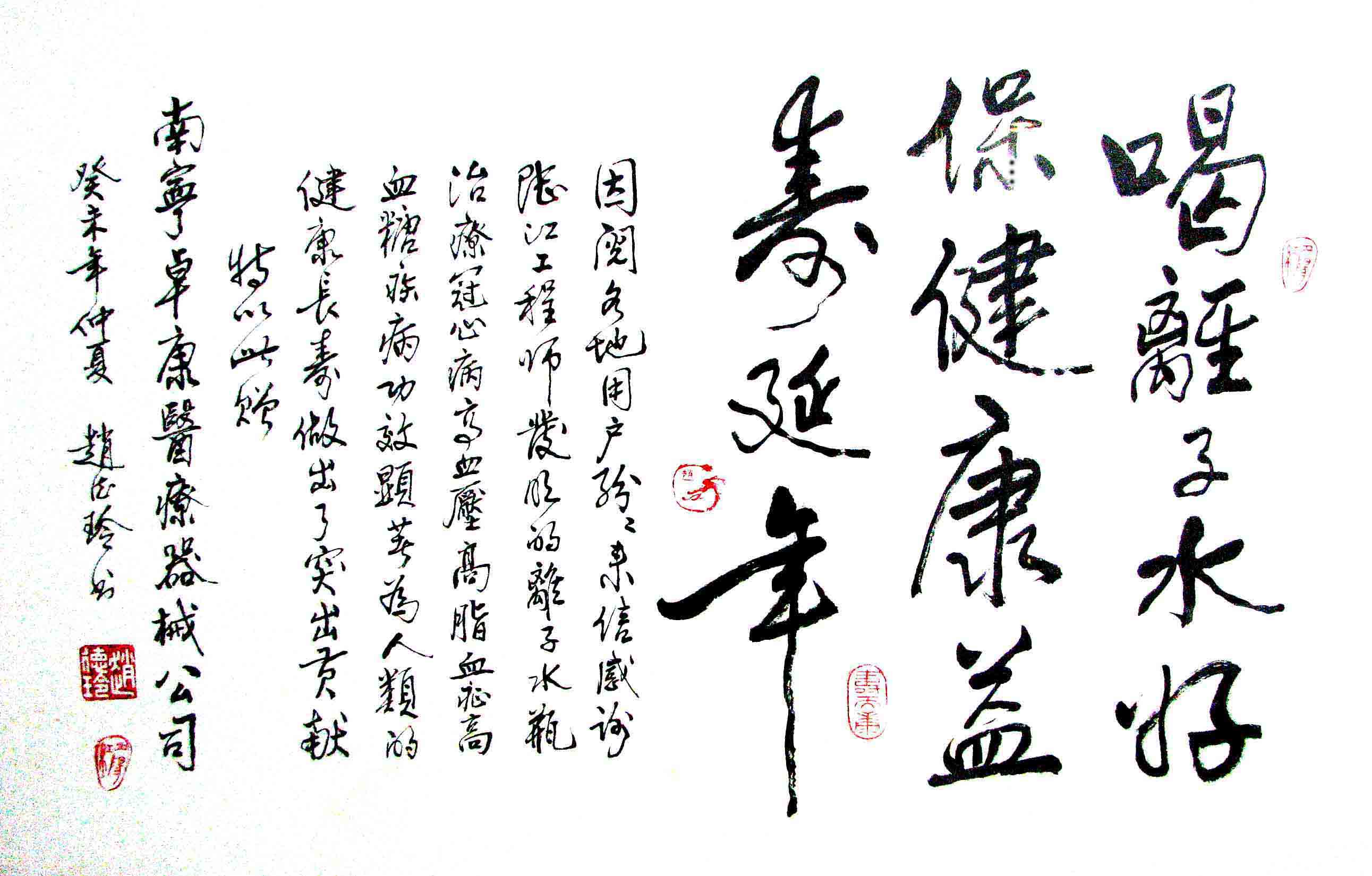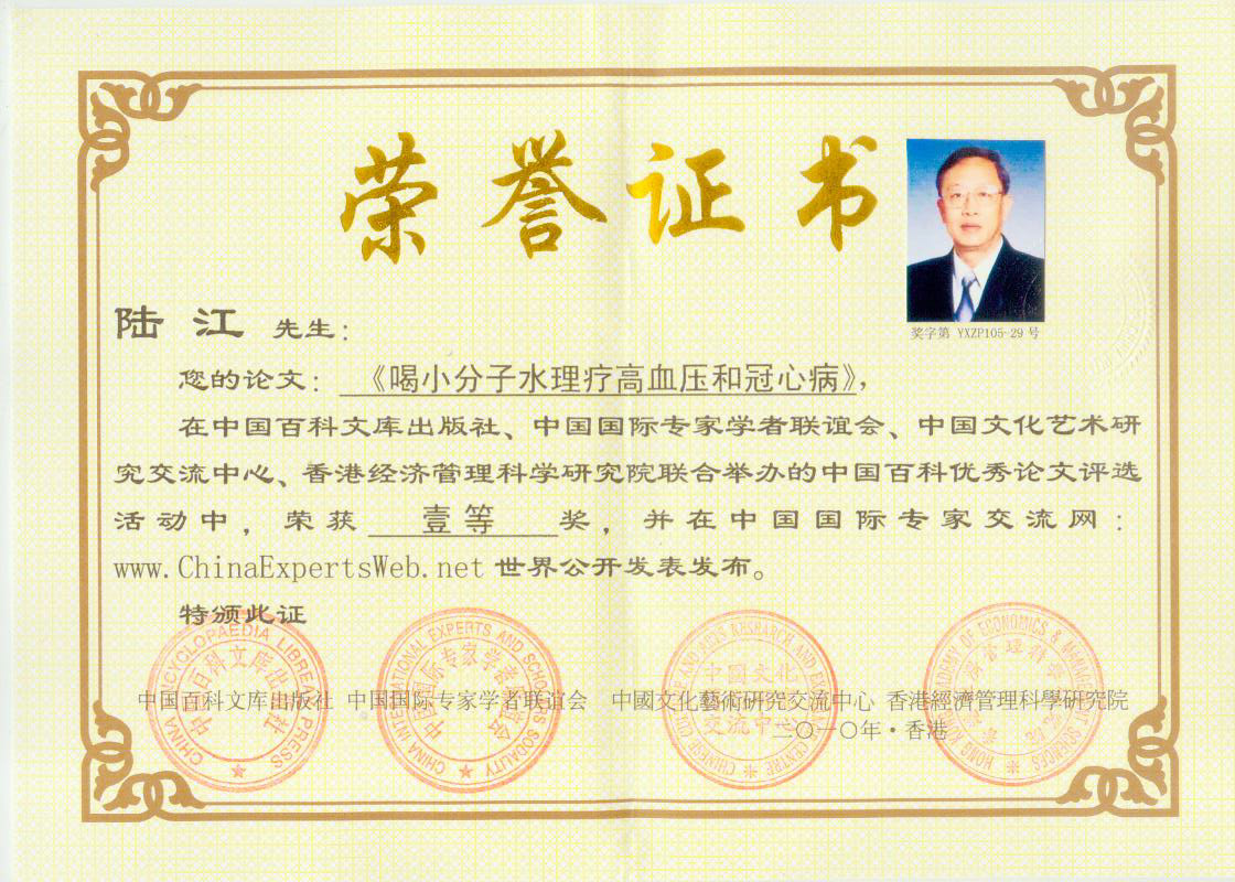 -----我是從事建筑的高工,本來沒有資格去攻克醫(yī)學(xué)難題,卻為了自身健康才扣響醫(yī)學(xué)的大門。由于我1990年患高血壓,因怕中風(fēng)才研究發(fā)明了離子水瓶,我把水處理成微小分子團水,飲用后治愈了高血壓。便于1993年底送到三家省級醫(yī)院做臨床試用4個月。經(jīng)北京和廣西醫(yī)學(xué)專家鑒定:"降脂降壓效果好"," 能擴大心腦動脈流量,改善心腦電圖以及微循環(huán)","對治療心腦動脈粥樣硬化、高血壓、高血脂有良好的醫(yī)療保健作用。""產(chǎn)品的技術(shù)性能和療效達(dá)到了同類產(chǎn)品的國內(nèi)領(lǐng)先水平,經(jīng)廣西醫(yī)學(xué)科學(xué)情報研究所檢索,未見國外有類似報道。"中國醫(yī)學(xué)科學(xué)院張正國教授從美國國立醫(yī)學(xué)圖書館數(shù)據(jù)庫存Medline檢索英俄文資料,均未見類似報告。2000年上市后,我為了對消費者負(fù)責(zé)而繼續(xù)觀察研究,一直通過《信譽卡》和《質(zhì)量跟蹤調(diào)查書》向患者承諾療效,請用戶使用6個月后反饋效果。和脂壓患者飲用2至5個月內(nèi),消除癥狀,停服藥物,血壓正常;冠心病患者飲用3~5個月逐漸減輕至消除心絞痛、房顫等癥狀,不再服藥,飲用1年左右心電圖正常,經(jīng)冠脈造影掃描無明顯狹窄,表明冠心病痊愈。大量患者還反映許多衰弱器官被修復(fù),讓前列腺增生、慢性咽喉炎、慢性氣管炎、支氣管炎、慢性胃炎、腸炎和膽囊炎等不藥而愈;2型糖尿病患者是因為胰島衰弱致病,飲用該水半年至一年,逐漸減藥至停藥,血糖尿糖正常,真正治愈2型糖尿病。中風(fēng)后遺癥患者飲用六七個月,可逐漸減輕至消除肢體和語言障礙,表明飲用該水能讓壽命很長的神經(jīng)元細(xì)胞逐漸修復(fù),奇跡般地恢復(fù)肢體和語言功能。飲用后還使胸腺和脾臟兩個重要的免疫器官被修復(fù)和增強,產(chǎn)生免疫細(xì)胞多,提高了免疫力,使人不生病或少生病。自此, 飲用微小分子團水創(chuàng)造了攻克冠心病、高(低)血壓和糖尿病三大醫(yī)學(xué)難題的奇跡。人們對此感到不可思議,但實踐是檢驗真理的唯一標(biāo)準(zhǔn)。