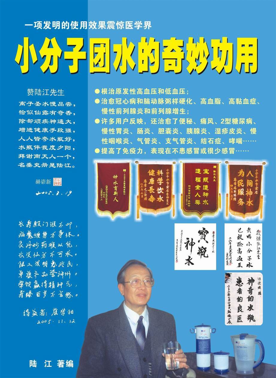 ----我國飲用微小分子團水,在世界上率先攻克了高血壓、冠心病和2型糖尿病,可以為國為民節(jié)省巨額醫(yī)藥資源,這是一項系統(tǒng)的惠民工程??墒钱?dāng)前推廣難,阻力大。好在我國于2014年1月15日發(fā)表了中國科學(xué)家在國際上首次拍攝到小分子團水照片,表明有4個水分子締合的小簇團和單個水分子。[注3]但是教肓跟不上,我國詞典上至今不寫小分子團水,醫(yī)學(xué)教材中還沒有寫,醫(yī)生和我國許多人不懂小分子團水。某些人習(xí)慣于用常識否定發(fā)明,亂寫文章,誤導(dǎo)民眾,憑想像否定實踐出真知,忘記了實踐是檢驗真理的唯一標(biāo)準(zhǔn)。這是很重要的大是大非問題,人類不應(yīng)當(dāng)為缺水性的病終生吃藥和得不到健康,而是應(yīng)當(dāng)飲用微小分子團水治好病,并且避免因細(xì)胞缺水造成器官衰弱而致病,以延緩衰老,延長壽命。