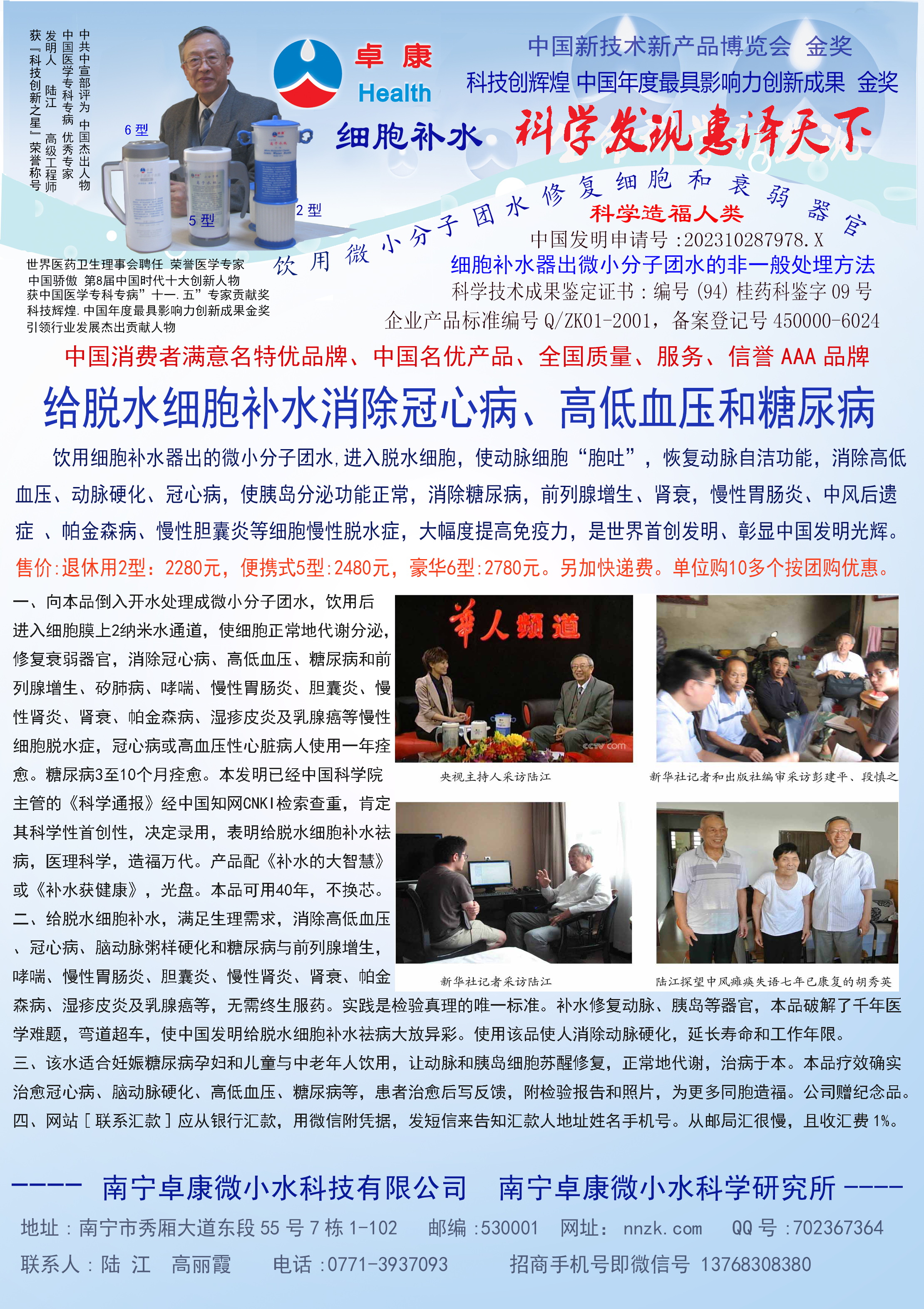 - -- 幾千年來,人類靠醫(yī)藥不能根治冠心病、高血壓和糖尿病,如想根治,那是夢想。可是,我從中國基礎(chǔ)醫(yī)學(xué)研究成果受到啟發(fā),研發(fā)了一種發(fā)明產(chǎn)品,處理出微小分子團水讓人飲用,實現(xiàn)了人類這一夢想!患者飲用后遠(yuǎn)離了冠心病、高血壓和2型糖尿病。這一成果曾經(jīng)過臨床試用和專家鑒定,作為準(zhǔn)字號醫(yī)療器械讓廣大患者飲用,療效進行跟蹤調(diào)查。很多患者的反饋情況令人感動,我放在公司網(wǎng)站上(nnzk.com),震撼了醫(yī)學(xué)專家,也使廣大同胞受到啟發(fā)。人們盼望飲用它給細(xì)胞補水,治愈多種病癥,既省錢,又安全,而且延長壽命。